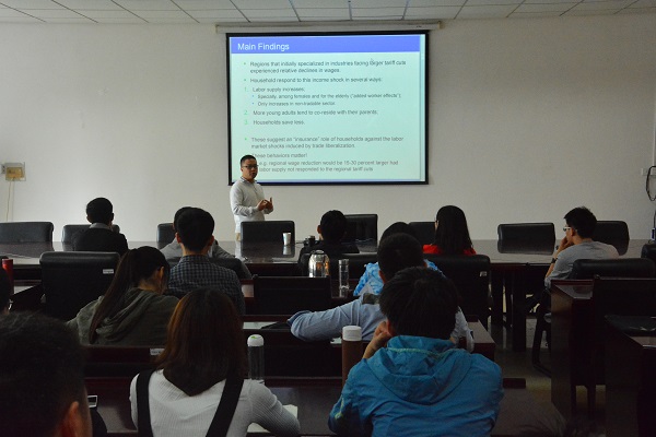 4月27日上午,应我院邀请,北京师范大学国际经济与贸易系副教授戴觅在我校仙林校区德经楼308会议室召开了题为“家户如何适应贸易自由化:来自中国加入WTO的证据”的讲座。我院杨继军教授、杜运苏教授、其他学院的部分老师以及部分研究生聆听了讲座。 讲座上,戴觅通过比较不同行业的关税下降幅度、城市的产业结构,分析了家户在贸易自由化背景下所受到的冲击。他指出,现有的文献把关注点主要放在了贸易市场对劳动力市场的冲击上,...