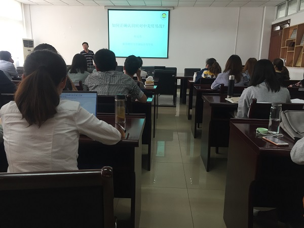 2018-05-10我院举办第16期青年学者论坛——我校副教授杜运苏做讲述“如何正确认识及应对中美贸易战”