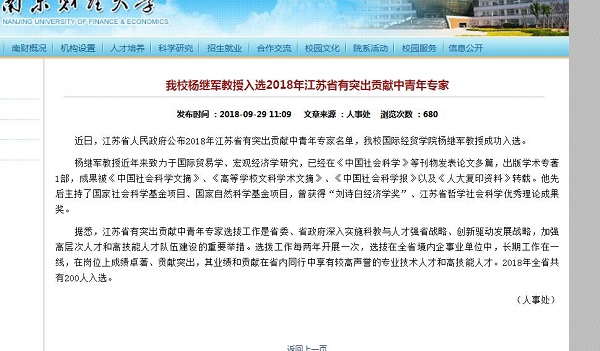 近日,江苏省人民政府公布2018年江苏省有突出贡献中青年专家名单,我院杨继军教授成功入选。 杨继军教授近年来致力于国际贸易学、宏观经济学研究,已经在《中国社会科学》等刊物发表论文多篇,出版学术专著1部,成果被《中国社会科学文摘》、《高等学校文科学术文摘》、《中国社会科学报》以及《人大复印资料》转载。他先后主持了国家社会科学基金项目、国家自然科学基金项目,曾获得“刘诗白经济学奖”、江苏省哲学社会科学优秀理...