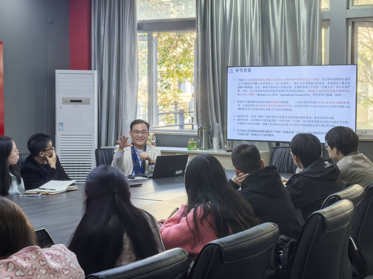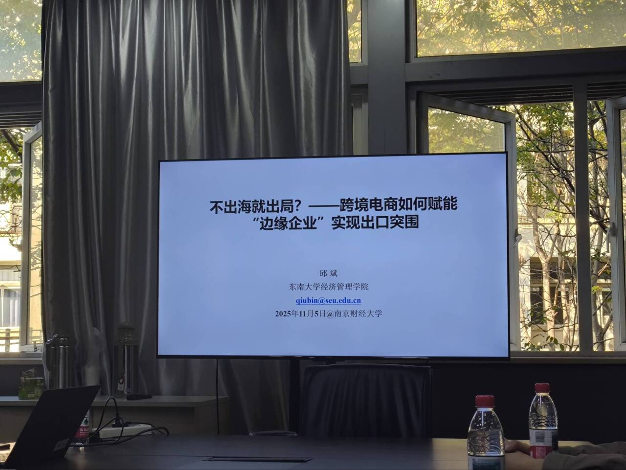 2025年11月5日下午3:00,东南大学国际经济研究所所长邱斌教授莅临我院学术前沿论坛,为师生带来“不出海就出局?——跨境电商如何赋能‘边缘企业’实现出口突围”的专题学术讲座。讲座由7790必发集团谭用教授主持,我院部分青年教师和硕博研究生参与。