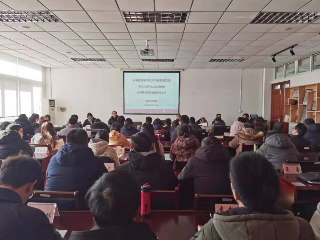 12月16日,我院组织全体教职工在德经楼308会议室集中观看校党委书记张利民专题党课《学习习近平生态文明思想 做好绿色经济发展研究工作》。