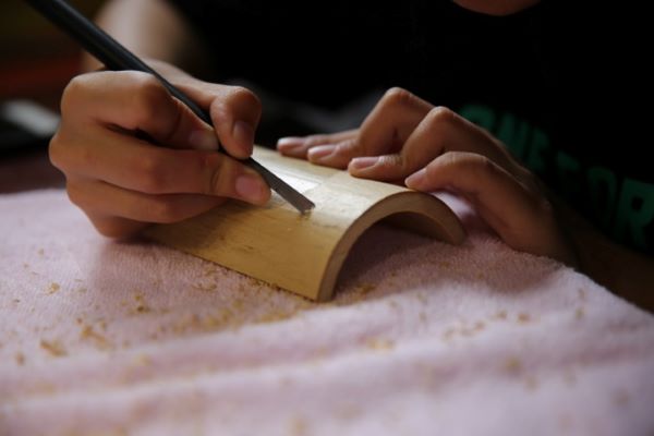 随后,范老师带领小队成员体验了留青竹刻最基本的技法:铲底。这个技法对于角度力度要求非常高,稍有不慎多用了些力,便无法补救了。小队成员表示:“体验过后才知道手工业者的不易,才短短刻了不到半天,不光手指酸痛,竹片也被刻的坑坑洼洼,完全不达要求。”