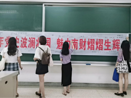 此次活动得到毕业生的踊跃参与,同学们纷纷在印有“百年党史波澜壮阔,魅力南财熠熠生辉”的巨大横幅上签字,并送上“未来可期”、“前程似锦”、“顺顺利利”等字样表达对母校对同窗的美好祝愿;通过“夏天的遇见就在夏天告别吧”、“剩下的话就留在盛夏吧”等语句抒发自己即将离校的黯然;使用“江湖再见”、“顶峰相见”表达对相逢的期望;通过书写“这是我们青春里最华丽的一章”总结在南财的收获……随后,毕业生们举起爱校爱党的展板拍照留念,在照片中展示自己作为南财学子的精神风貌。