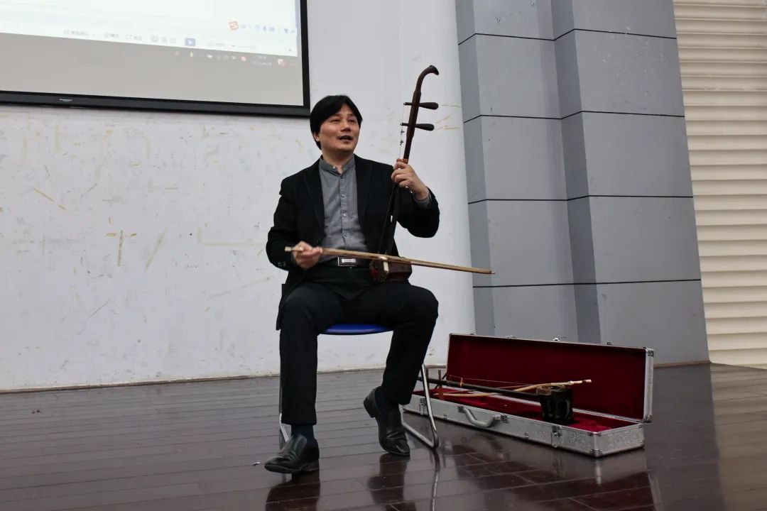 讲座伊始,林东坡教授从经典的“哲学三问”入手引导大家了解国乐的含义,连接传统与当下,深入了解国乐文化并树立文化自信。他指出,中国古典乐器一般按“八音”分类,即“金、石、土、革、丝、木、匏、竹”八类。此外,他提到二胡的音色会受到演奏技巧与风格的影响,比如某些民间艺人常常用短分弓演奏乐曲,音色不似演奏家那样圆润柔和,反而变得激昂具有很强的感染力。
