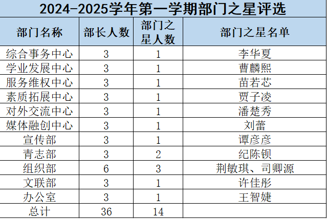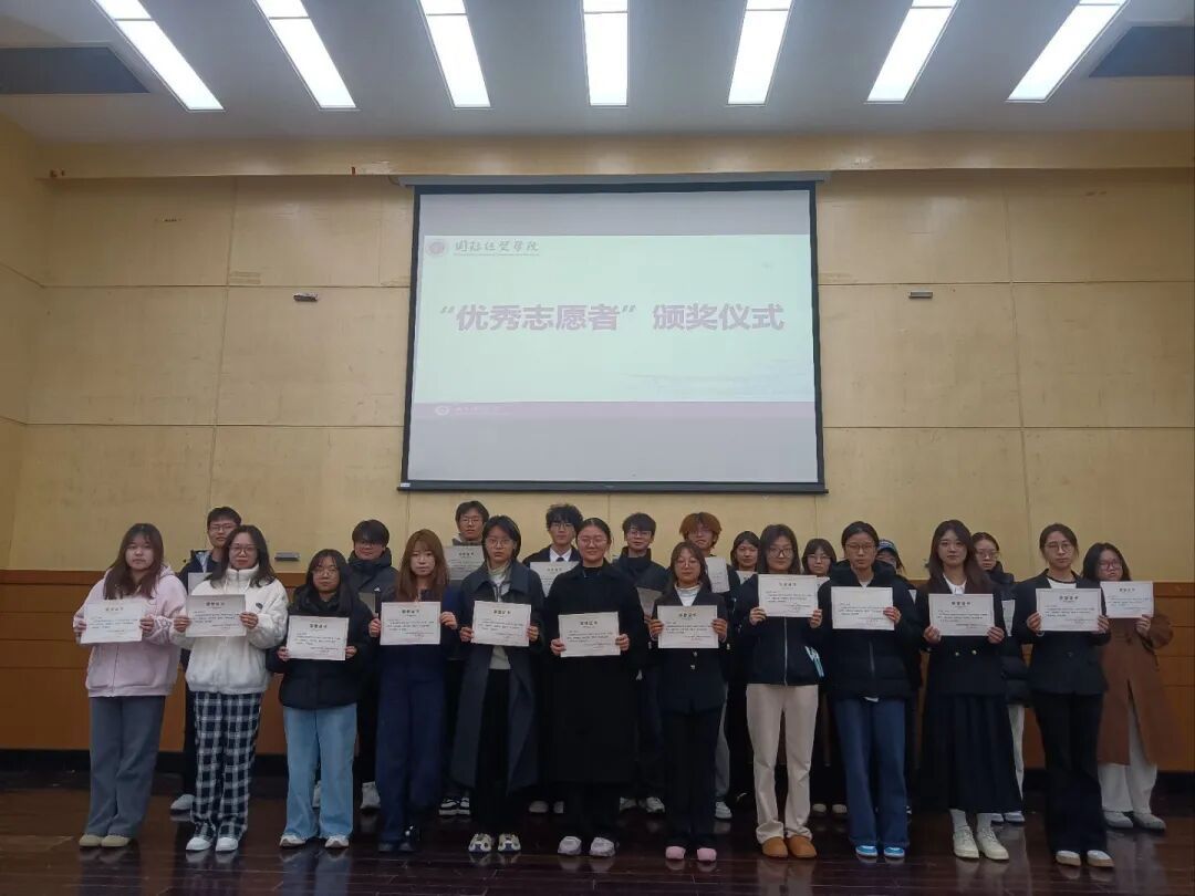 述职答辩环节结束后,大会正式进入颁奖环节。经过前期志愿者互评、负责人评议志愿者、主席评议负责人三个板块的人事考核,再经团委学生副书记与主席团综合审核确定,各部门共评选出优秀志愿者3名;部门之星方面,组织部、媒体融创中心各2名,其余部门1名。学生会主席团成员为获奖同学颁发荣誉证书,台下掌声阵阵,既是对获奖人员的热烈祝贺,也激励着全体学生会成员以先进为标杆,锐意进取、争先创优。