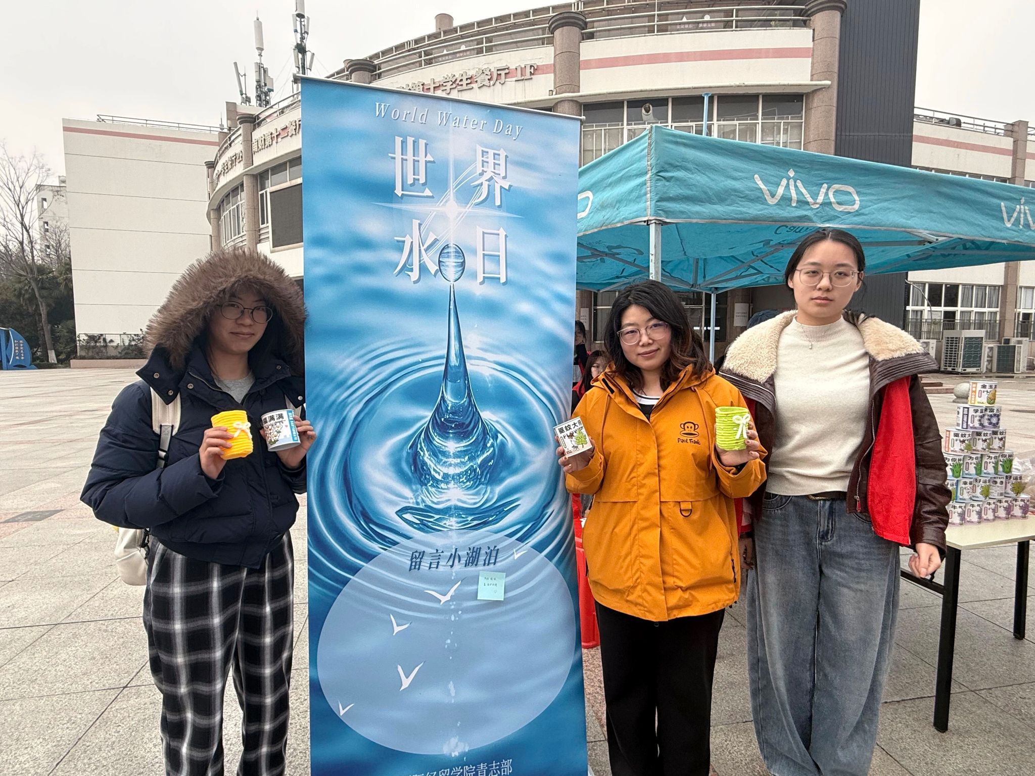塑料瓶以物换物区同样热闹,同学们携带干净塑料瓶参与以物换物,按瓶数兑换绿植、环保袋等实用礼品,用实际行动助力资源回收,趣味节水知识问答同步开展,大家踊跃答题比拼护水常识,答对即可领取定制小礼品,在轻松互动中夯实节水认知;湖盆造型的节水主题留言墙前,大家拿起淡蓝色便利贴,写下节水宣言、惜水小技巧与环保感悟,一张张便利贴承载着护水初心铺满墙面,成为现场一道温暖的风景线。