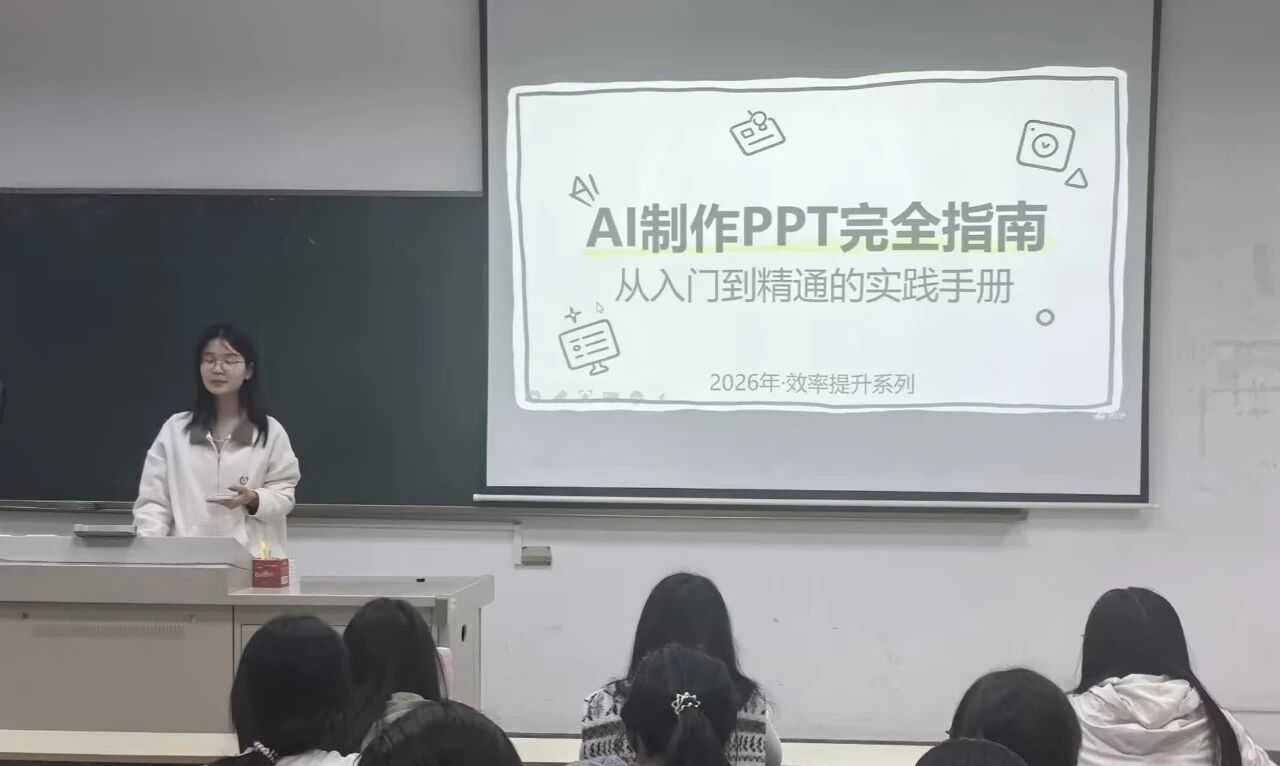 分享环节中,朱灿灿同学聚焦豆包、Nano Banana两款PPT创作AI工具展开讲解,着重强调优质PPT需兼顾严谨内容逻辑与精致视觉呈现。同时,她向同学们演示了她依托豆包生成PPT的完整流程:先搭建完善文字底稿,优化调整后再生成演示文稿,让在场同学收获直观感悟。