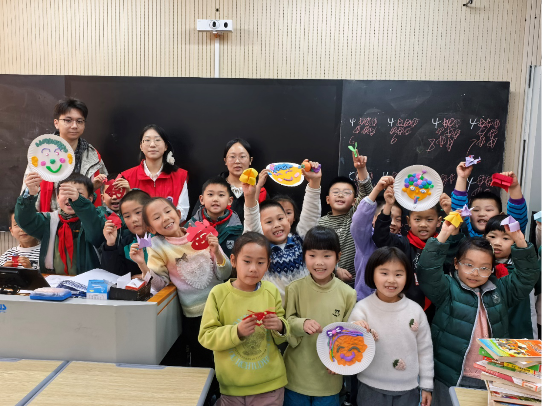 此外,志愿者们还为孩子们带来剪纸、情绪脸谱等兼具趣味性与传统文化气息的创意手工。现场材料丰富,孩子们迫不及待投入创作:剪纸环节,大家跟着步骤折叠剪裁,将彩纸变成形态各异的春日图案,童趣十足;情绪脸谱制作中,孩子们大胆配色、勾勒五官,一个个生动鲜活的脸谱陆续成型,每完成一件作品,孩子们都满是成就感,现场欢声笑语不断。